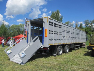 | Особенности комплектации автомобиля | Расчетная вместимость: крупный рогатый скот –до 26 голов -весом до 550 кг., до 33 голов - 450 кг.,до 54 голов - 220 кг. , свиньи –фактически – до 80 голов. Грузоподъемность – 22 000 кг., собственный вес – 8 000 кг., длина 13,6 м. Шасси – двухосное, односкатное, пневмоподвеска, ЕBS «Нaldex», «Wabco» Кузов – собран из металлических оцинкованных стоек с поперечинами на крыше. Снаружи облицован алюминиевыми листами, два ряда вентиляционных окон на боковых стенках, закрываемых металлическими заслонками (новая усиленная конструкция). На крыше – ламинированная фанера 9 мм, покрытая листом алюминия. Задний проем: откидной дверь-трап, со складными бортиками, позволяет легко производить погрузку-выгрузку. Внутри – три перегородки. Пол – рифленый металлический лист с тремя продольными профилями от проскальзывания копыт, покрытие – герметичное полимерное покрытие. Дополнительно устанавливаемое оборудование – поилки (для свиней или для КРС – 6шт), вентиляторы, освещение трапа и кузова (2 прожектора). Боковая аварийная дверь-трап. Высота ССУ – 1200 мм. |