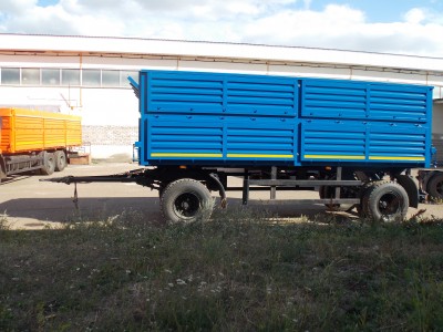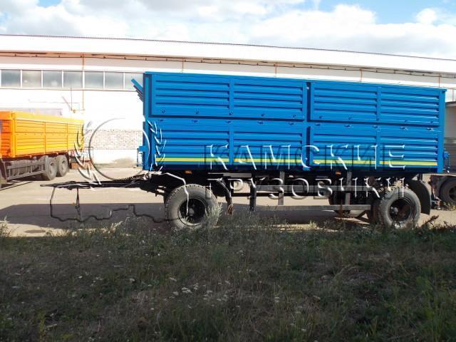 Бортовая платформа, ручное запирание бортов, верхний ряд бортов глухой, нижний ряд бортов с верхней навеской. Цвет платформы по выбору. Используемые материалы пол 3мм,борта 2мм. Прицеп может комплектоваться пологом с наматывающим устройством, задними распашными воротами, люком под зерномет.